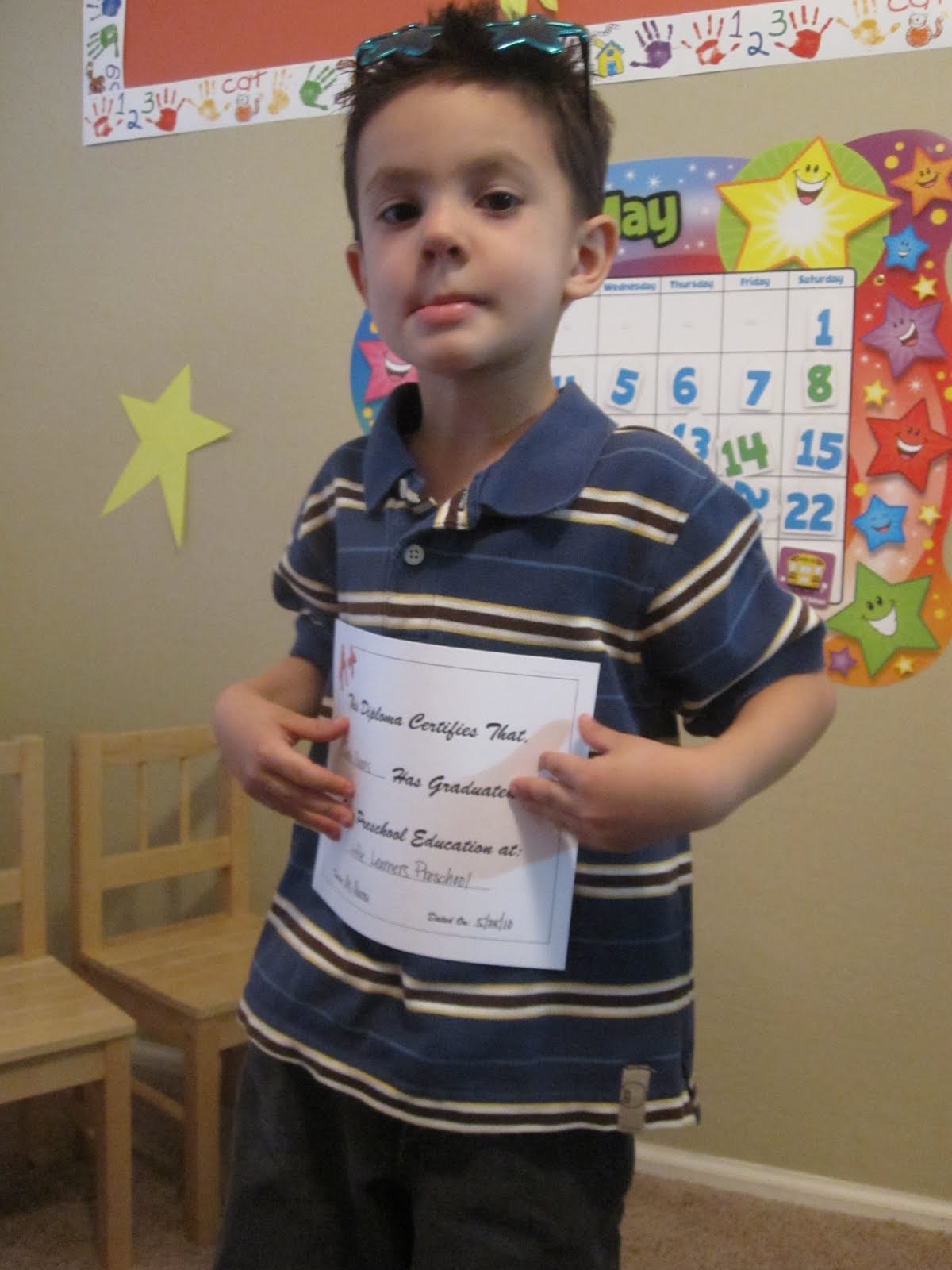 I no longer have a preschooler. He's got the paper work to prove it, he's now a Kindergartner. Jacob and I both loved Mrs. Marni she was firm with Jacob which is what he needs, but also loving with him which is also important to Jacob too. Jacob didn't need to go to school to learn he already knew most of his colors, shapes, could count to ten, and the start of his ABC's. I needed him to learn how to sit in a structured environment. Well Mrs Marni not only taught him that but so much more. he can do all of his colors, shapes, can count to 50, and can say them A-Z. I am so happy with everything he has learned with Mrs. Marni. Jacob and I will miss her very much.